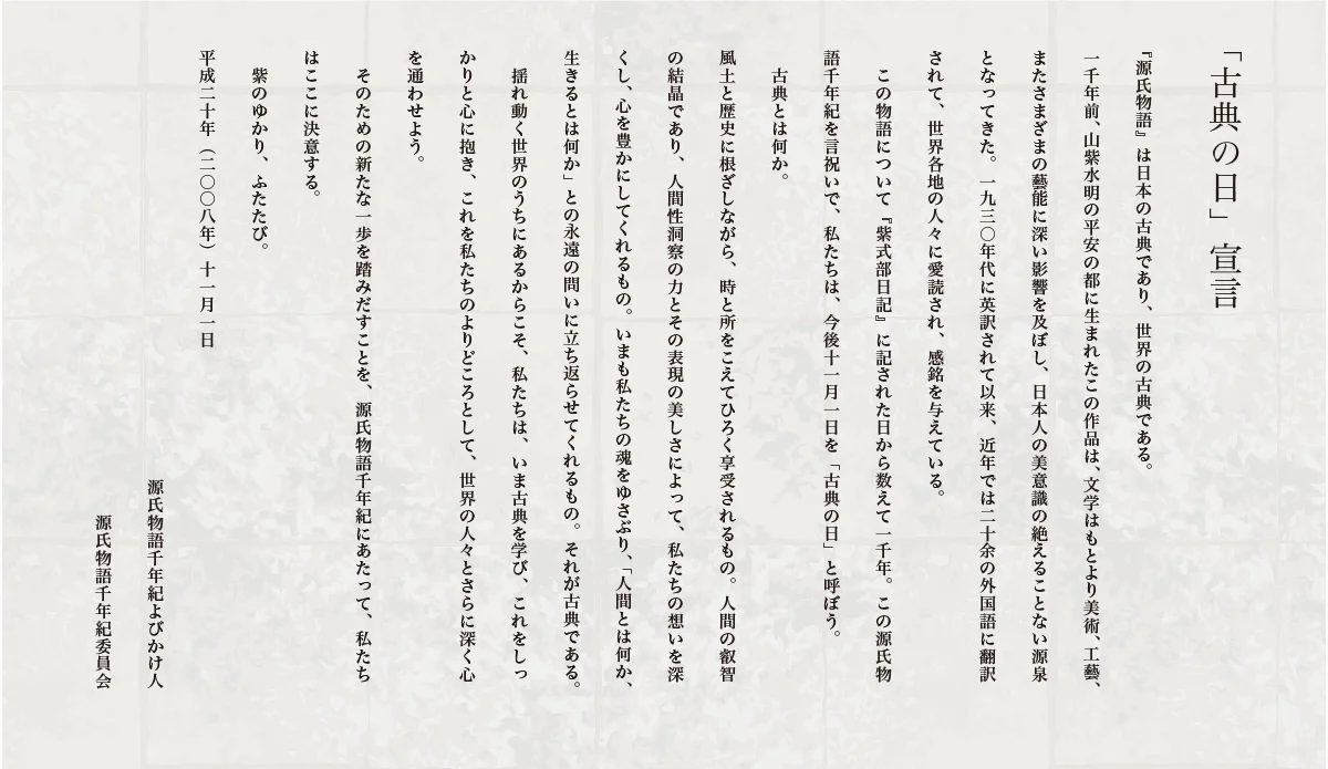 国立京都国際会館に於いて、天皇皇后両陛下の御臨席のもと、『源氏物語』をはじめとする古典を日本の誇りとして後世に伝えることを改めて決意し、古典に親しむ日として「古典の日」宣言を行う。 - 2009(平成21年)4月1日 古典の日推進委員会の発足
